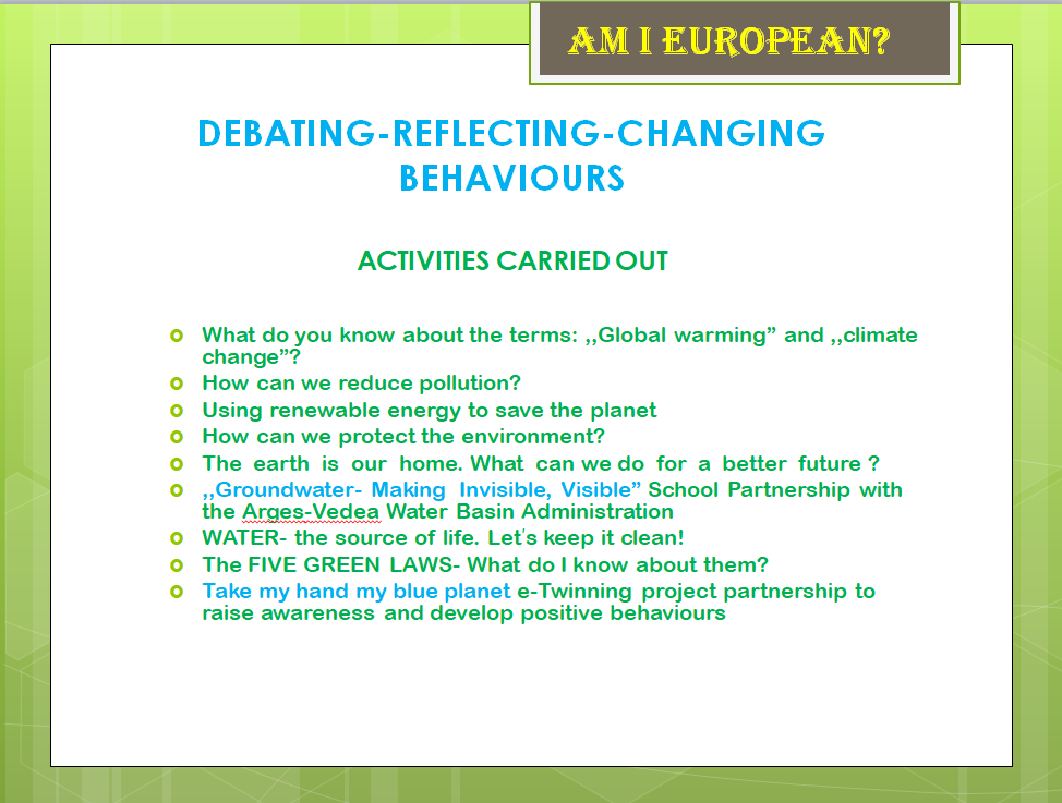 În săptămâna 8- 12 noiembrie 2021 a avut loc in Murcia, Spania, prima mobilitate internațională în cadrul proiectului Erasmus + “Am I European?” , la care au participat patru cadre didactice ale Școlii Gimnaziale “IANCU VĂCĂRESCU”, Văcărești. Proiectul Am I European? KA201  – STRATEGIC PARTNERSHIP  FOR SCHOOL EDUCATION 2020-1-UK01-KA201-078978 se deruleaza în perioada 2020-2023 și are ca parteneri școli și organizații din Țara Galilor, Spania, Turcia și România. Prima zi a mobilității a debutat cu primirea oficială a partenerilor din cadrul proiectului într-o  ședință ce a vizat prezentarea proiectului și a colaboratorilor. Doamna Shayla  ne-a făcut un tur al şcolii “La Arboleja” , activitate ce a fost continuată de elevi ai școlii ce au salutat în limbile ţărilor participante şi au oferit câteva informaţii despre fiecare ţară în parte. Aceştia au prezentat un scurt  program artistic ce a inclus şi dansuri naționale din Spania. Reprezentantul Turciei, Emrah Kocak, a realizat o activitate prin care a solicitat fiecărui participant la acest proiect să se prezinte şi să precizeze ce înseamnă pentru el termenul“ să fii european”, prilej cu care am reuşit să cunoaştem mai bine colegii din celelalte ţări. Ziua s-a încheiat cu intervențiile reprezentanților fiecărei instituții implicate și prezentarea programului de lucru pe perioada mobilității. Aceştia au vorbit despre implicarea în cadrul proiectului şi despre aşteptările pe care le au în urma finalizării proiectului. În cea de a doua zi, activitățile au continuat la Școala “ La Arboleja“ cu observarea elevilor în cadrul orelor de curs, elevii fiind impărțiți pe ateliere de lucru : activități sportive, dansuri populare, activități artistice. Am participat la workshopul “Critical thinking and debating “ realizat de WCIA prin intermediul trainerului Amber Demetrius.  A treia zi a mobilității s-a centrat pe vizita la scoala “ D Jose Marin” . Elevii au fost impărțiți în mici grupuri de 5 -6 elevi care ne-au oferit un tur al școlii. Aici au fost prezentate activitățile desfășurate și produsele realizate de către elevii claselor aV-a si a VI-a  în cadrul numeroaselor ateliere, în vederea atingerii obiectivelor proiectului. Ei au  realizat prezentări Power Point cu steagurile, monumentele istorice și istoria țărilor împlicate în proiect. De asemenea, ei au realizat broșuri cu locurile pe care le poți vizita în Cieza, cum ar fi Muzeul Siyasa, Muzeul de Folclor, locuri unde ne putem caza și mânca. Ziua s-a încheiat prin  vizitarea sitului archeologic, Medina Siyasa, din orașul Cieza.Un ghid turistic ne-a prezentat istoria acestui sit. Pe parcursul celei de-a patra zi am fost plăcut surprinşi de prezenţa unei “ biblioteci mobile” sosită în curtea şcolii “ La Arboleja”, copiii împrumutând alte cărţi sau restituind cărţile împrumutate. Ziua s-a continuat cu participarea cadrelor didactice  la workshop-ul “Using videos and pictures to improve critical thinking skills”, organizat de trainerul Amber Demetrius, activitate urmată de  o vizită spre centrul orașului Murcia,  pornind de la școala “ La Arboleja “ Am vizitat statuia lui Jose Maria Munoz, primăria și catedrala din Murcia.